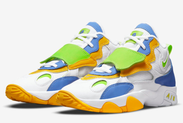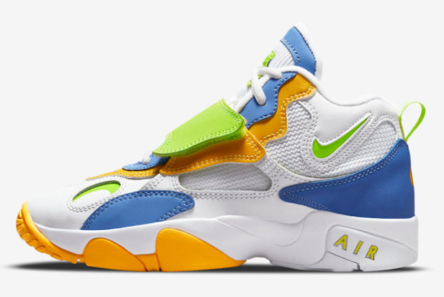 3. Versatile Design: The Nike Air Max Speed Turf GS showcases a versatile design that effortlessly blends modern aesthetics with classic retro styling. The combination of colors – white, blue, green, and yellow – adds a vibrant and playful touch to the shoe, making it visually appealing for both athletic and casual purposes.