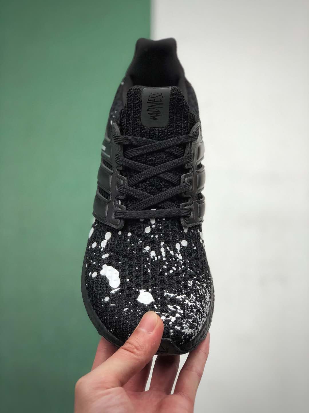 – Adidas and Madness branding details on the tongue and heel tab.