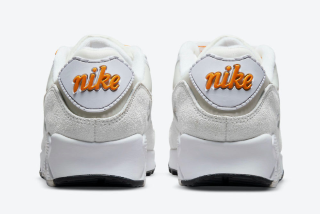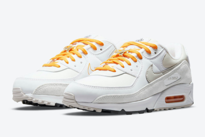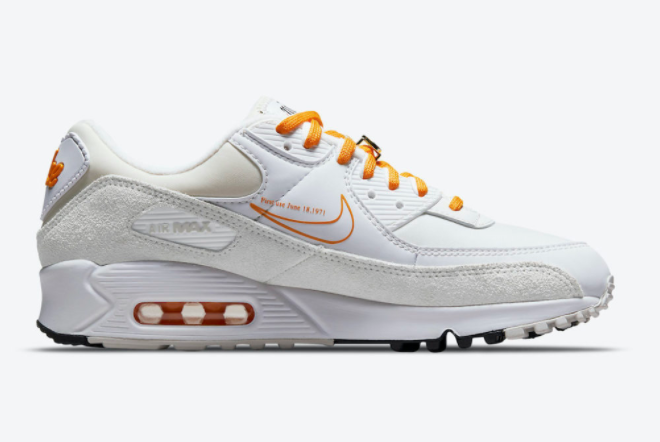 1. First Use Theme: This Air Max 90 celebrates Nike’s first use of its renowned Swoosh logo in 1971. The sneaker’s upper features a clean, white leather construction with contrasting Light Bone overlays, providing a premium look.