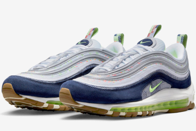 The Nike Air Max 97 ‘Sashiko’ Grey/Navy-Volt is designed for those who seek a perfect balance of style and performance. It features a unique Sashiko-inspired pattern, combining Japanese craftsmanship with contemporary flair. The shoe showcases a versatile color palette of grey, navy, and volt, making it suitable for casual outings or with sportswear.