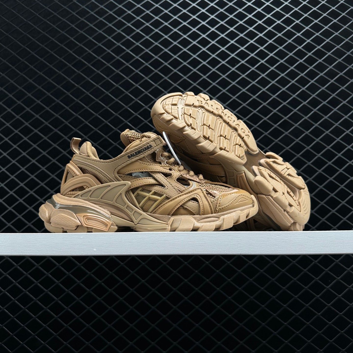 The Balenciaga Track Camel sneakers are constructed with a combination of materials, including mesh, nylon, and leather, creating a luxurious and durable shoe. The upper is adorned with layers of intricate panels, giving it a multi-dimensional and futuristic appearance. The camel brown color adds a touch of warmth and versatility to the overall design.