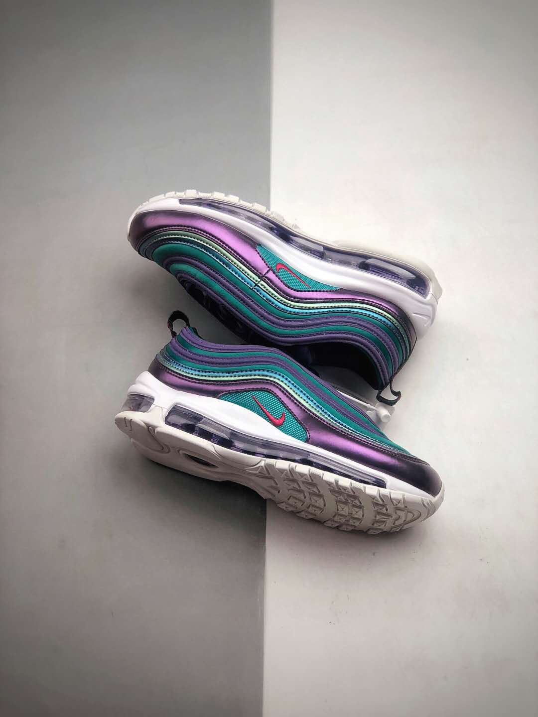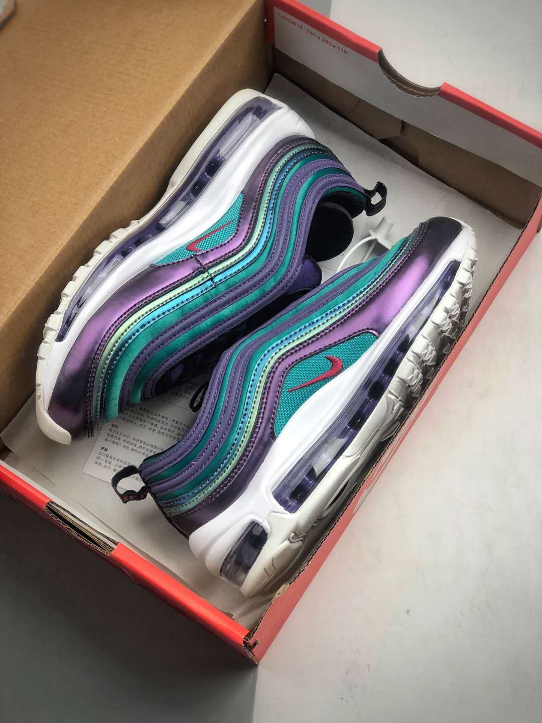 1. Iridescent Upper: The standout feature of these sneakers is the eye-catching iridescent upper. The upper changes color depending on the angle of the light, ranging from vibrant hues of purple, green, and blue. This stunning design element adds a touch of glamour and uniqueness to the classic Air Max 97 silhouette.