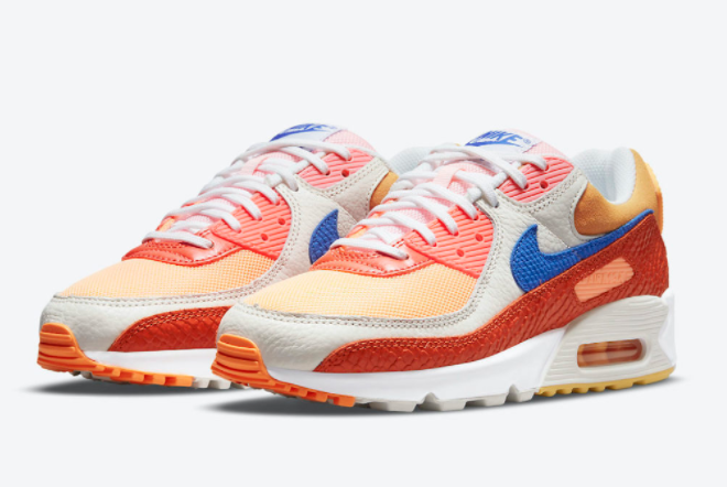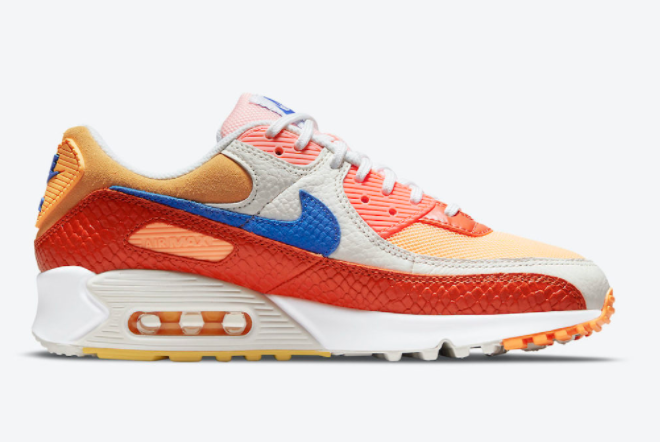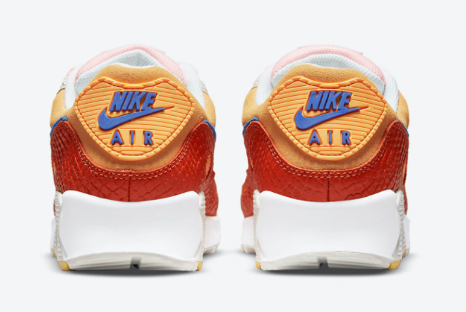2. Vibrant Color Scheme: The Nike Wmns Air Max 90 ‘Snakeskin’ DJ8517-800 comes in a vivid orange hue, creating a striking contrast against the snakeskin pattern. This color choice adds a pop of color to any outfit.