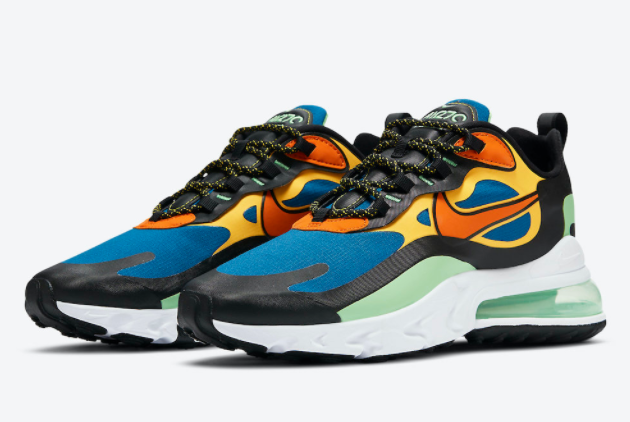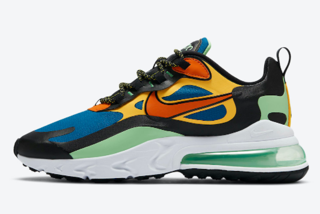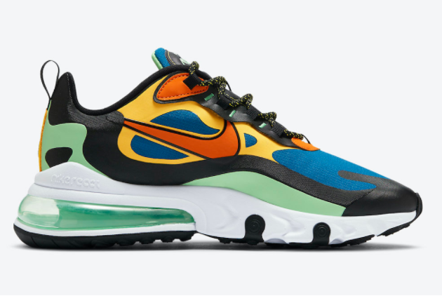 The Nike Air Max 270 React is renowned for its innovative features that ensure maximum comfort and durability. The shoe boasts a breathable mesh upper that keeps your feet cool and fresh, even during the most intense workouts. With the incorporation of Nike React technology, you’ll experience enhanced responsiveness and cushioning, allowing for a more fluid and energized stride. The Air Max unit in the heel provides exceptional impact absorption, protecting your joints from strain and ensuring a comfortable wear all day long. The durable rubber outsole offers excellent traction on various surfaces, so you can confidently take on any terrain. Additionally, the striking color combination of Green Abyss, Black, Laser Orange, and Starfish makes these sneakers a standout choice for those who crave a bold and vibrant style.