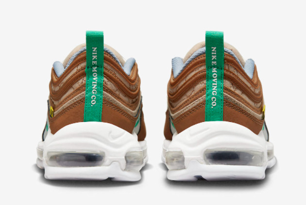 The Nike Air Max 97 SE ‘Moving Company’ Hemp/Stadium Green-Ale Brown-White DV2621-200 is a unique sneaker that perfectly blends style and comfort. Inspired by the moving company branding, this shoe features a color palette that echoes the earthy tones of hemp fields and lush greenery. It is an absolute must-have for sneaker enthusiasts and trendsetters seeking a distinctive look.