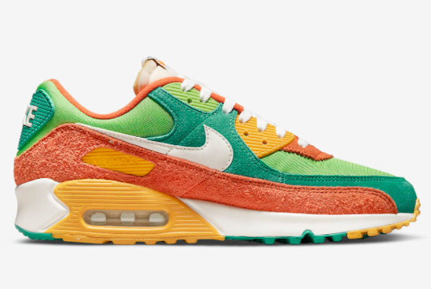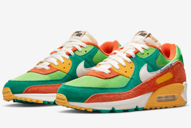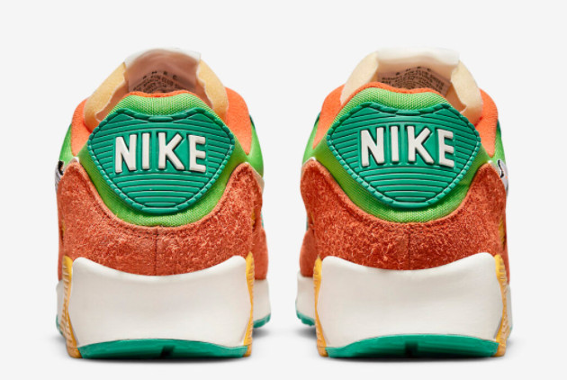 1. Premium Materials: Crafted with high-quality materials, the Nike Air Max 90 SE showcases durability and style. The Roma Green upper, combined with Sail, Orange, and Mean Green accents, create a visually striking look.