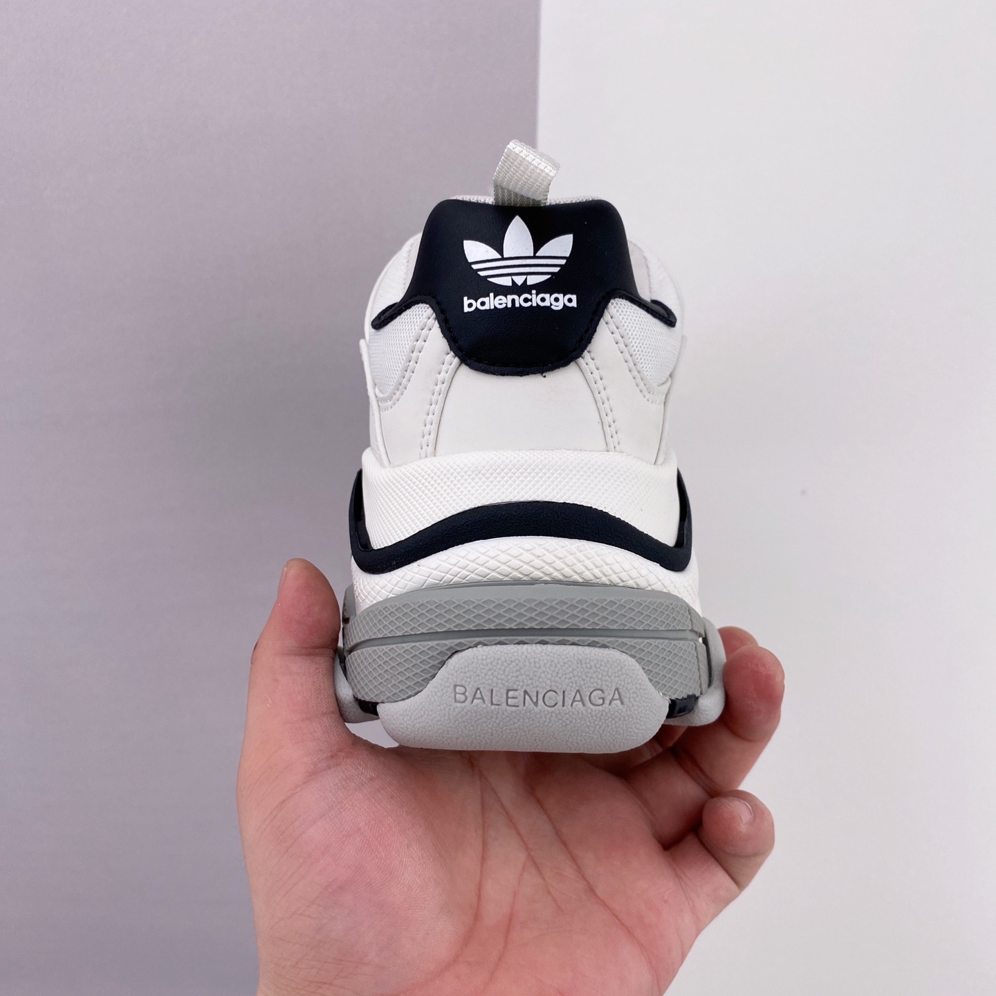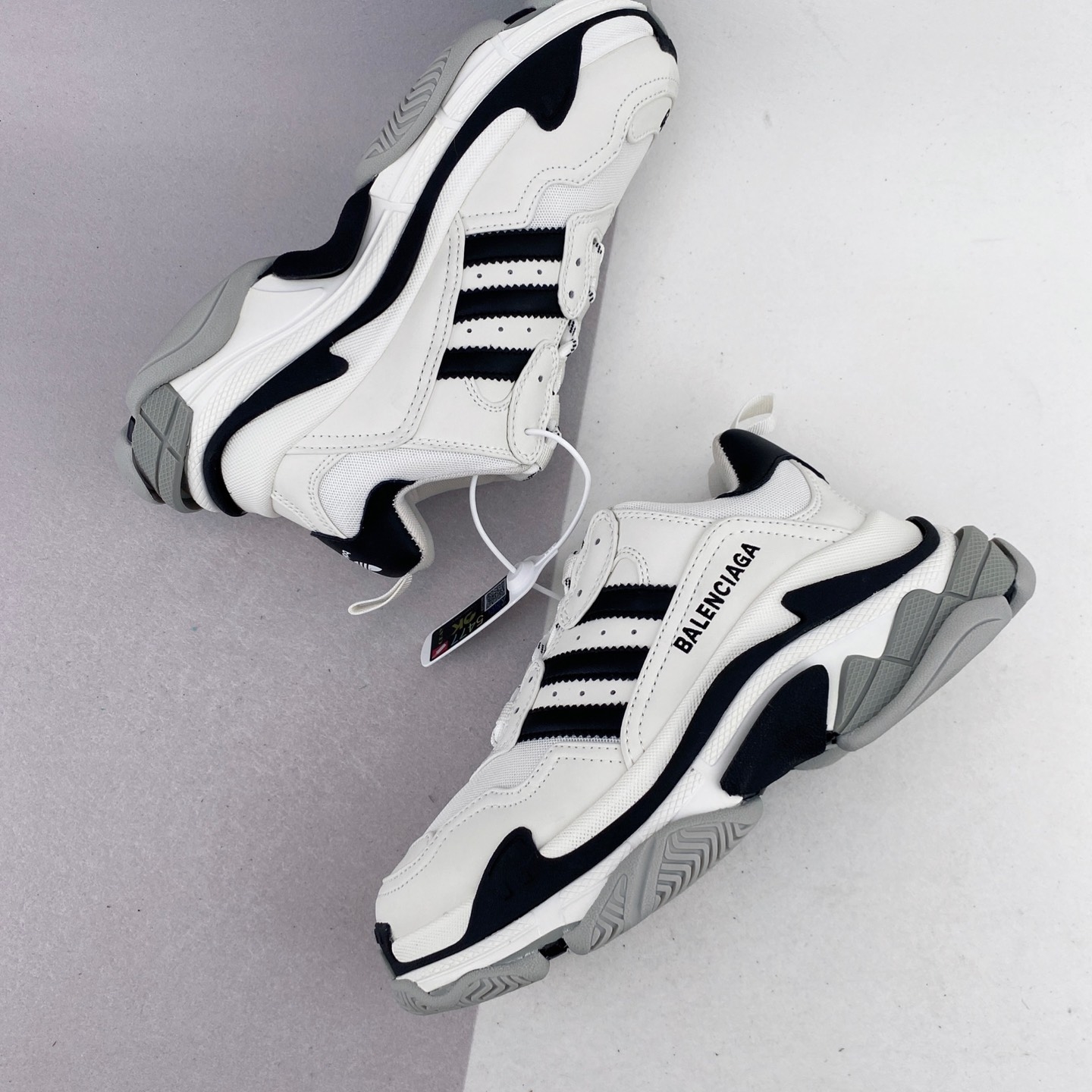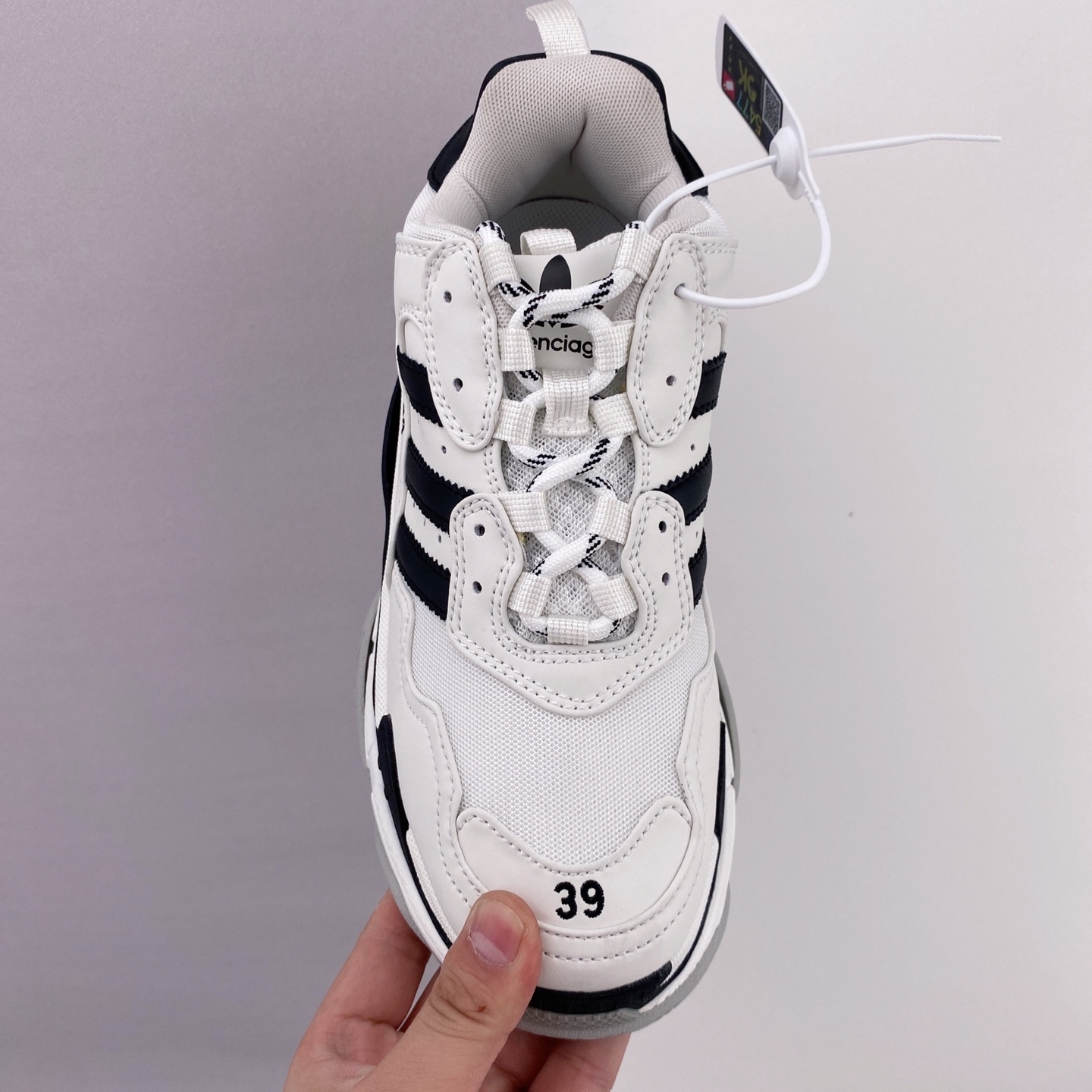 The color scheme of white and black is a timeless classic that effortlessly complements any ensemble, making these sneakers a versatile addition to your wardrobe. The Balenciaga and Adidas branding can be seen prominently on the tongue, side, and heel, adding a touch of luxury to the design.